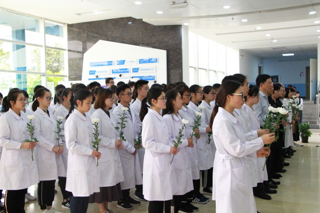 仪式现场庄重肃穆,医学院党总支书记李仲斐在开幕式致辞中讲述了大体老师对医学生学习解剖知识的重要帮助,要求医学院学子时怀感恩之心,感激无言良师。市红十字会李昌建副会长的讲话诠释生命的价值与仪式举办的意义所在。来自台州三门县的遗体捐献者家属戴女士分享丈夫的捐献故事,令全场潸然泪下。为大体老师与爱心捐献者默哀后,师生依次向大体老师鞠躬献花,表达感恩。仪式最后,医学生高举右拳齐念医学生誓词,向“大体老师”、人体器官捐献者、为医学事业做出贡献的小动物,致以崇高的敬意。