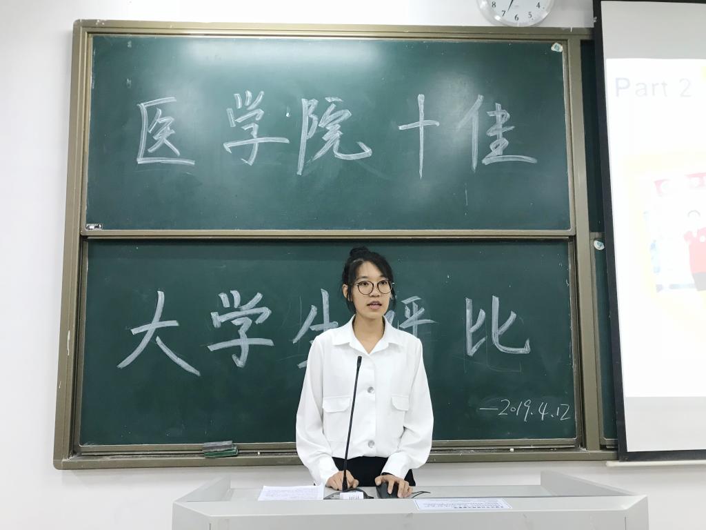本次评选旨在树立典型,培育德智体美全面发展,在思想道德、学业科研、志愿服务、社会工作等方面表现突出,模范践行社会主义核心价值观的优秀医学生。经集体推荐与学院初评后,13名来自各年级的优秀学生进入现场展示答辩环节。候选人们依次通过ppt、视频、演讲等形式展示大学期间的奋斗经历和个人荣誉,诠释奋斗的青春,赢得现场掌声阵阵。