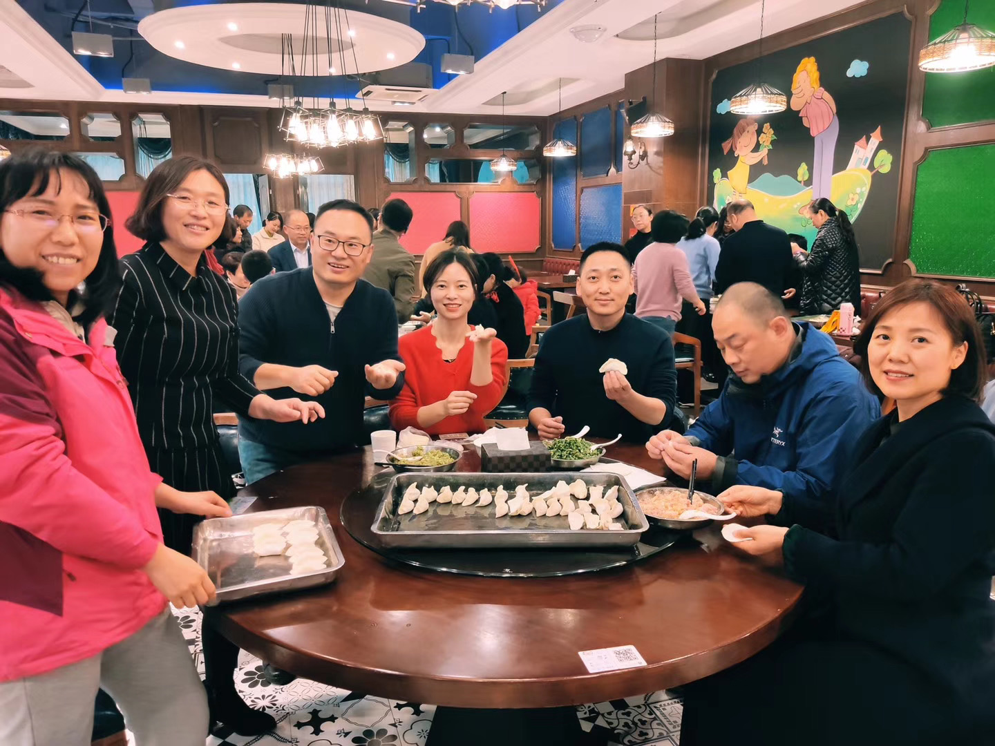 食堂已经准备好了馅料和饺子皮,大家便热热闹闹地动手包起来,大盆的肉馅和大叠的饺子皮摆在中间,很快一盘盘美观饱满的饺子出炉了。随后在大家的分工合作下,一碗碗热腾腾的饺子在期待中被端上了餐桌,吃着自己包的饺子,感受到了集体的温暖,也深刻体会了分工协作的好处,在这些饺子中裹着的是欢乐和祝福。