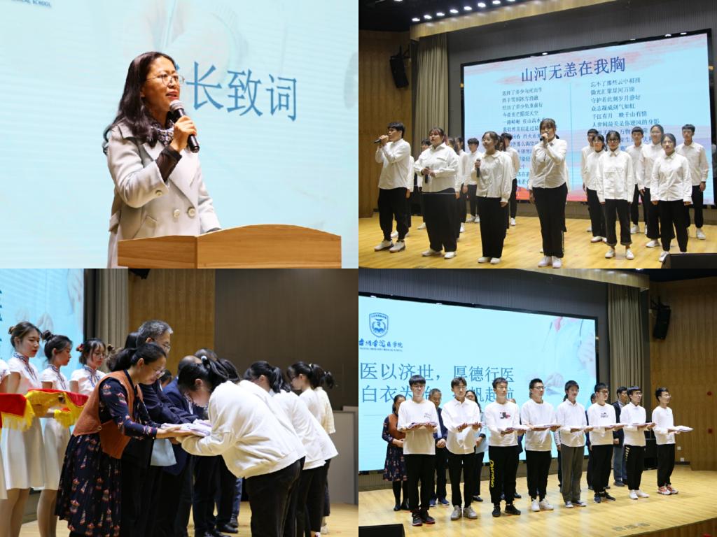 一曲«山河无恙在我胸»揭开了仪式的序幕,高昂深情的合唱曲宣告了身为医护人员的使命,鼓舞着医学生不忘初心,勇担职责。学生会执行主席龚菁菁发表讲话,希望新生热爱医学,勇立时代潮流,积极践行“知仁尚道,博修济人”的院训。仪式中,八位老师为20级新生们授予白大褂,新生们充满欣喜与期待地接过这份神圣的责任。“医学贵精,学医重仁”,身为医学生的他们敢于挑战、斗志昂扬,坚守救死扶伤、关怀世人的职责。新生代表林薇上台发言,庄严承诺将博采修己、不负韶华,为成为合格医学生而艰苦奋斗。荧幕上的视频祝福寄语和朗诵《医师,我们想成为你》饱含老师和师长师姐的祝福与期许。分团委副书记周明明带领新生们进行职业宣誓,神情坚定、语调铿锵,立下了“为祖国医药卫生事业的发展和人类身心健康奋斗终生”的誓言,自觉做一个德艺双馨、恪守医德的医学生。