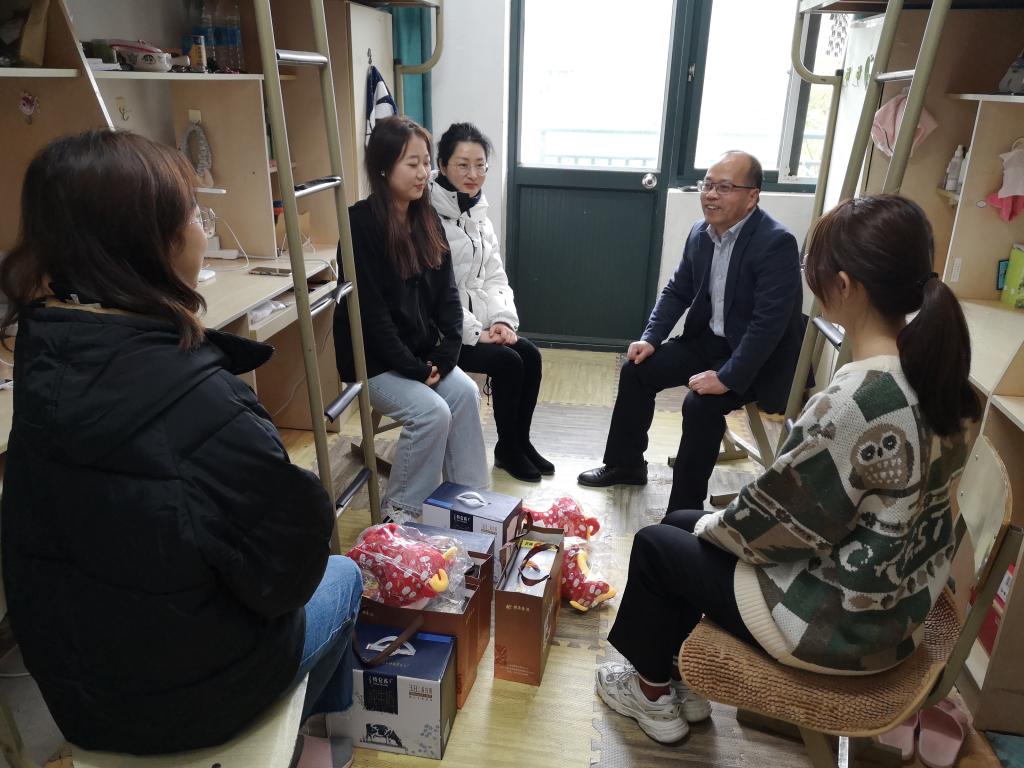 2月8日下午,医学院党总支书记李仲斐、副书记周敏在学工办主任陈兴明及辅导员金雯雯老师的陪同下到学生公寓看望假期留校学生,并为她们送上新春慰问礼品并致以温暖的节日问候。