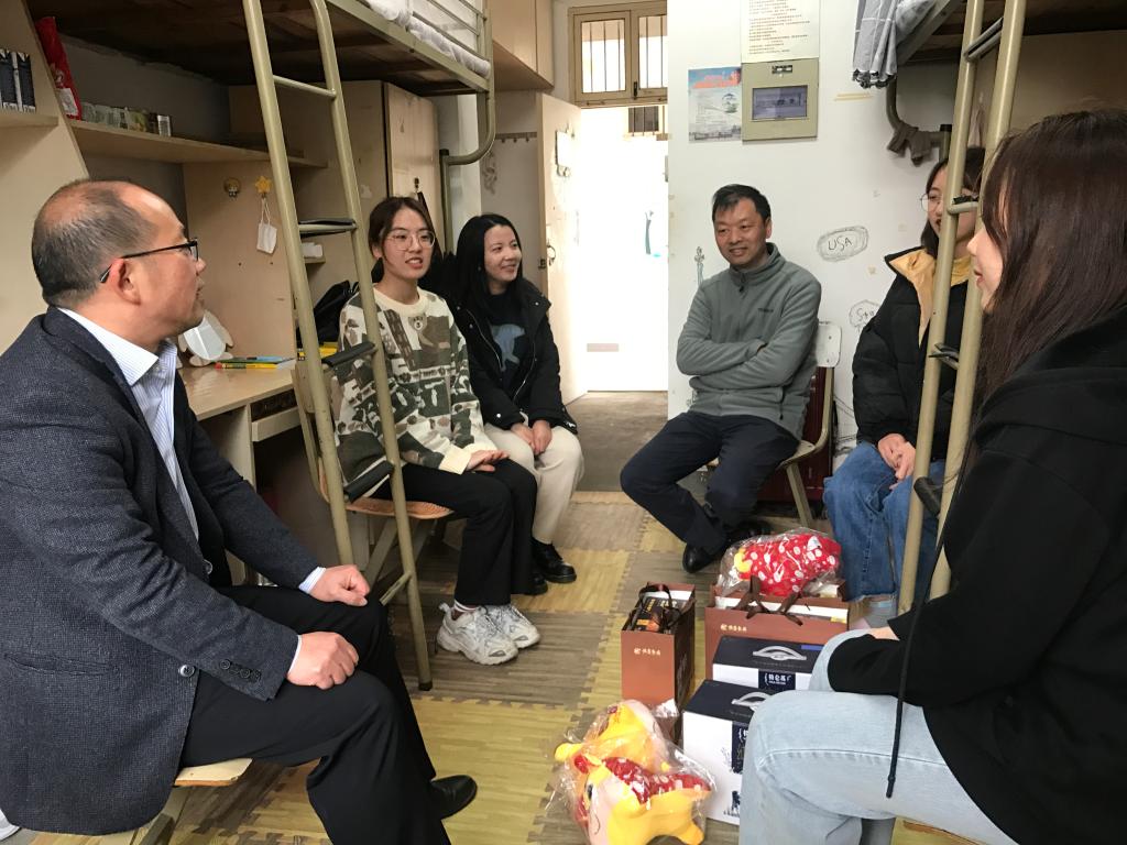 在学生宿舍,院领导与同学们亲切交谈。李仲斐书记详细询问了同学家乡有关疫情的情况,强调留校期间也要做好个人防护,保持良好作息习惯和心态,鼓励同学们学好专业,规划好未来,为就业或考研打好基础,并提前邀请3位同学去家里共度除夕,3位同学愉快地接受了邀请。