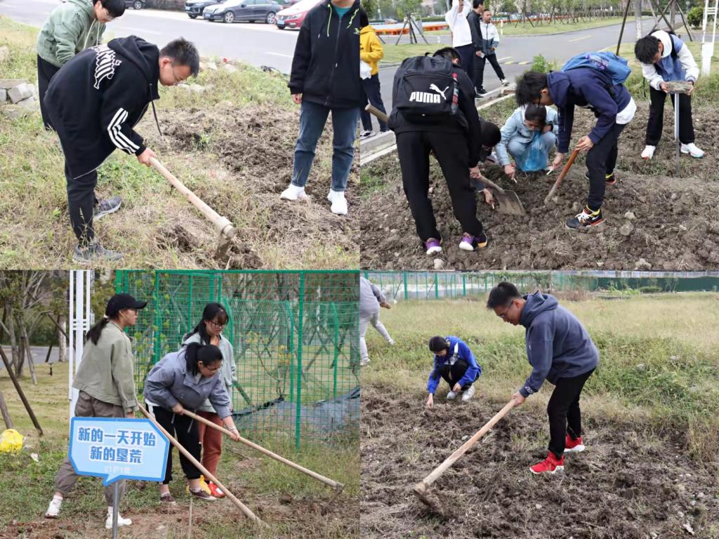 20级的垦荒积极分子为21级各班授花田班牌,各班负责人分别将班牌插入各班责任田。师生们说干就干,除草、破土,在花田中埋下希望的种子。