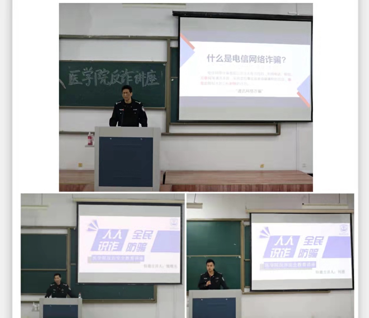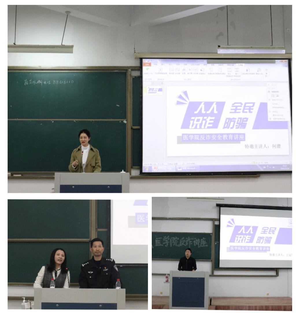 为了进一步提高师生防范电信网络诈骗的意识和能力,根据学校统一安排,医学院于11月4日下午举办“人人识诈,全民防骗”主题的防范电信网络诈骗宣传教育活动,特邀葭沚派出所主管治安的何潜副所长和从警十余年的业务骨干魏曙光、王冠军三位警官作专题辅导,此次活动共分两个阶段在三个分会场同时进行,医学院周敏副书记、李强和金雯雯老师分别主持会议,学院全体在校学生共1300余人参加学习。