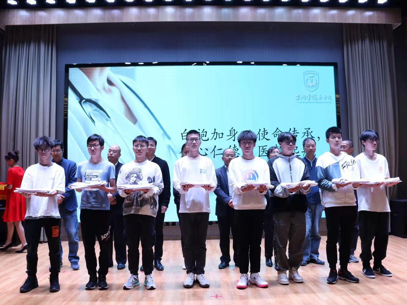 仪式中,八位教师亲自为新生授予白大褂,传承知识,交接使命。