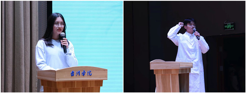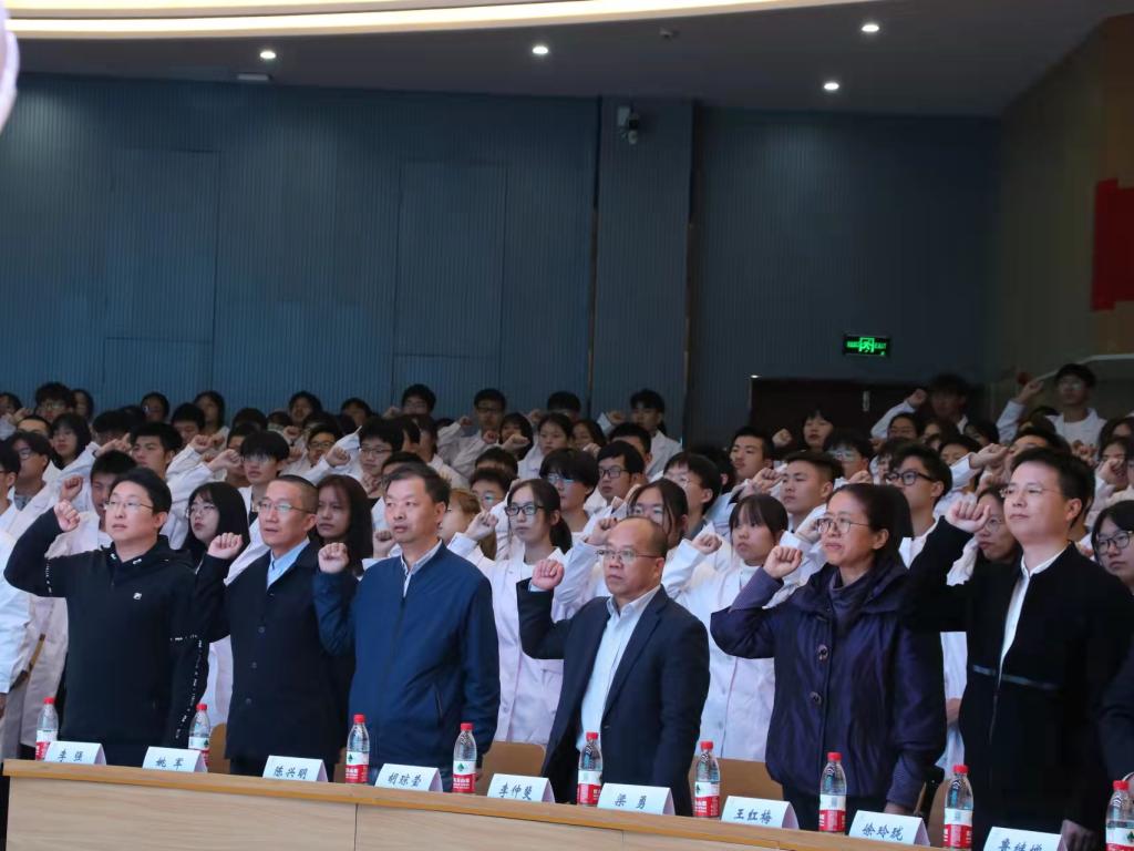 新生代表侯然发言,讲述了一身白衣所代表的责任、担当与奉献,诠释了这份职责的神圣。来自各个名校读研的学长学姐送来远方祝福视频,激励新生们医路向前,朗诵组的《医师,我们想成为你》表达了对新生最真诚的祝福和期望。学生会执行主席张路易带领宣誓,许下铮铮誓言,启航漫漫长路。他希望新生带着热枕与执着走上医学之路,坚持“知仁尚道,博修济人”的院训,牢记使命与担当。