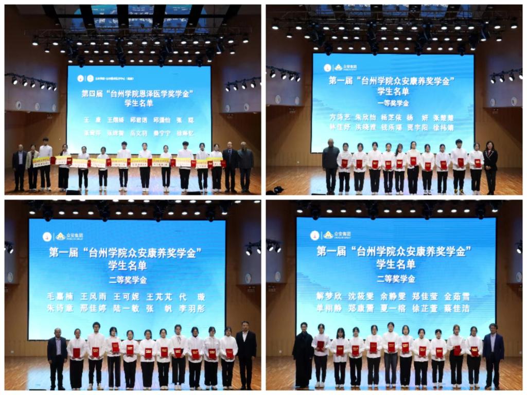 朱坚胜、毛鑫礼、梁勇、李仲斐为恩泽医学奖学金获奖同学颁奖;金霞、余小东、庄汝波、梁勇、李仲斐、周敏为众安康养一、二等奖学金获得者颁奖;陈兴明、章华婷、辅导员和班主任老师们分别为院十佳运动员、院十佳优良学风班、校特色寝室颁奖。