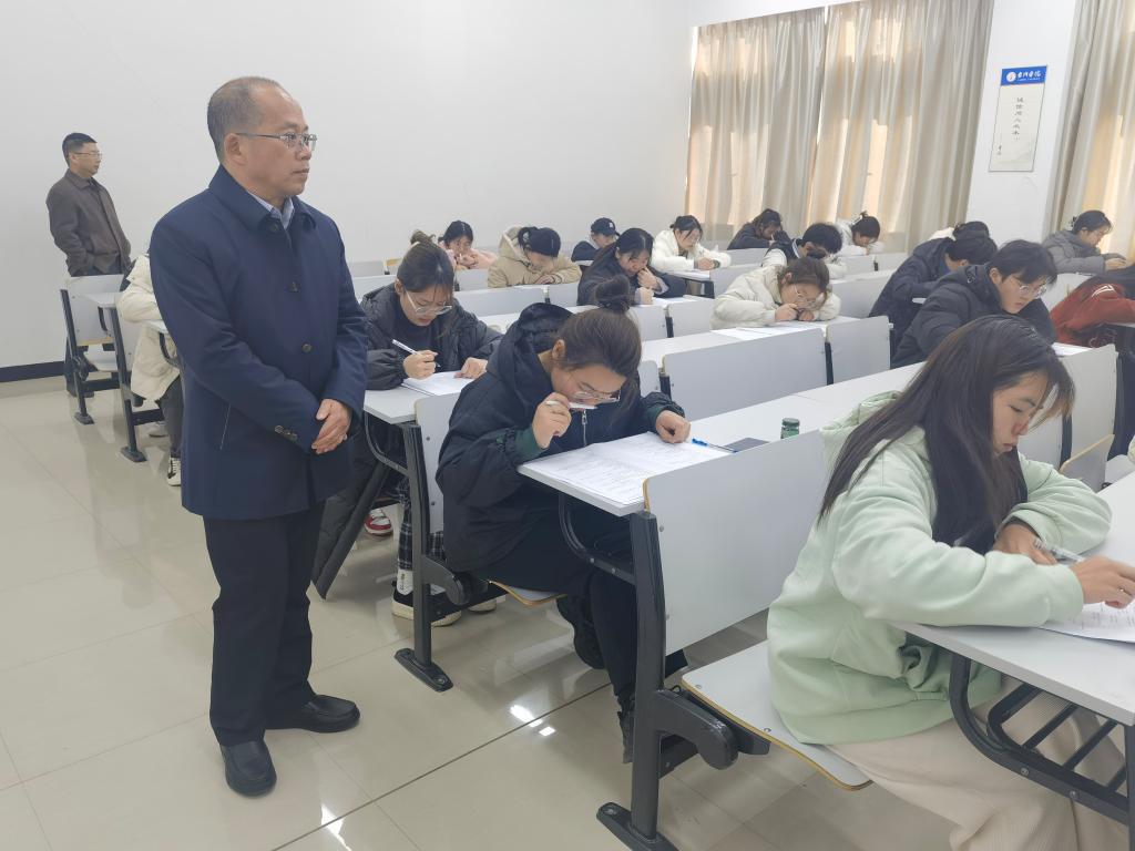 为加强教学管理,严肃考风考纪,2月20日上午,医学院院长曹轩、党委书记李仲斐、班子其他成员,在相关部门负责人员陪同下,深入到考试现场,巡视考试组织、考场秩序、监考人员履行监考职责及学生遵守考试纪律等情况。