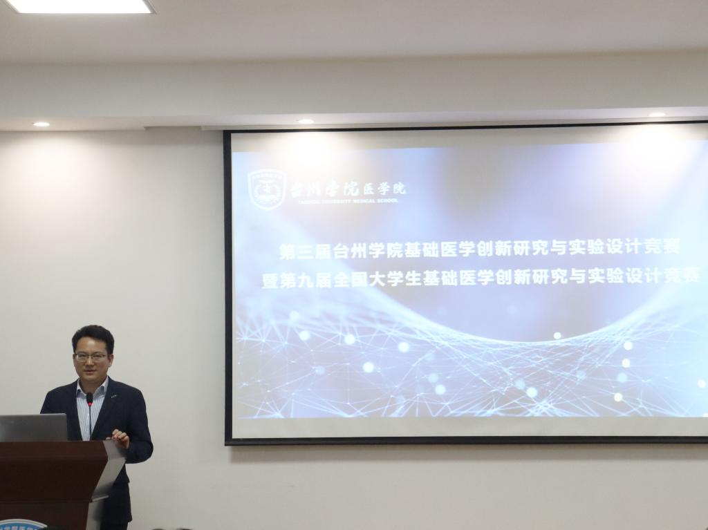 第三届基础医学创新研究与实验设计竞赛暨第九届全国大学生基础医学创新研究与实验设计竞赛于4月27日晚在医学院A437举行。医学院院长曹轩,医学院基础医学部主任陈光、生命科学学院郑伟龙、台州市立医院王彬辉、台州市中心医院徐煜彬、台州市第一人民医院李杰,以及医学院陈光、包晓红老师应邀出席并担任嘉宾与评委。