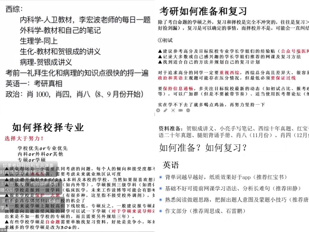 为持续提升医学生考研意识,增强考研备考能力,6月上旬毕业生返校期间,医学院举办多场线上考研交流会。医学院2023届薛智云、徐舟楠、傅舒凝等17位考研上岸毕业生受邀担任分享嘉宾,700余名医学生参与。