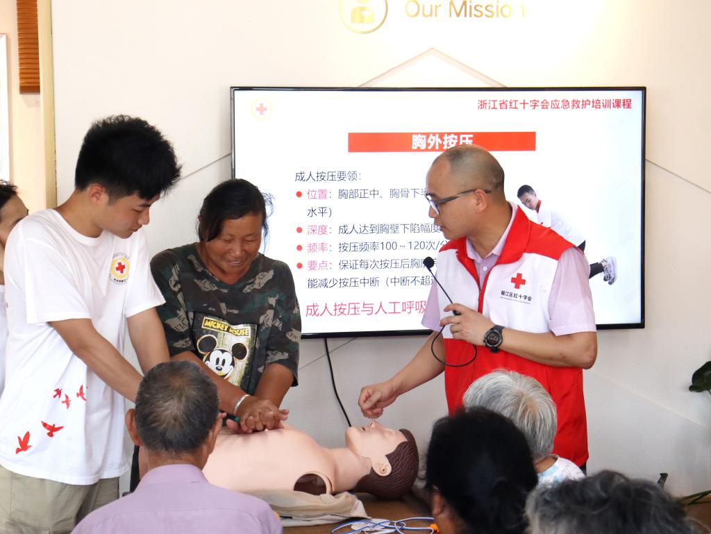 椒江区红十字会、浙江省红十字一级救护师苏滔为大陈镇居民、救援消防站及景区工作人员,开展应急救护与健康知识培训,形象地为居民们讲解出血、现场包扎、骨折固定以及心肺复苏等应急措施,从心肺复苏的核心三步骤入手,就准确判断、规范操作、评估复苏指征等进行重点讲解。