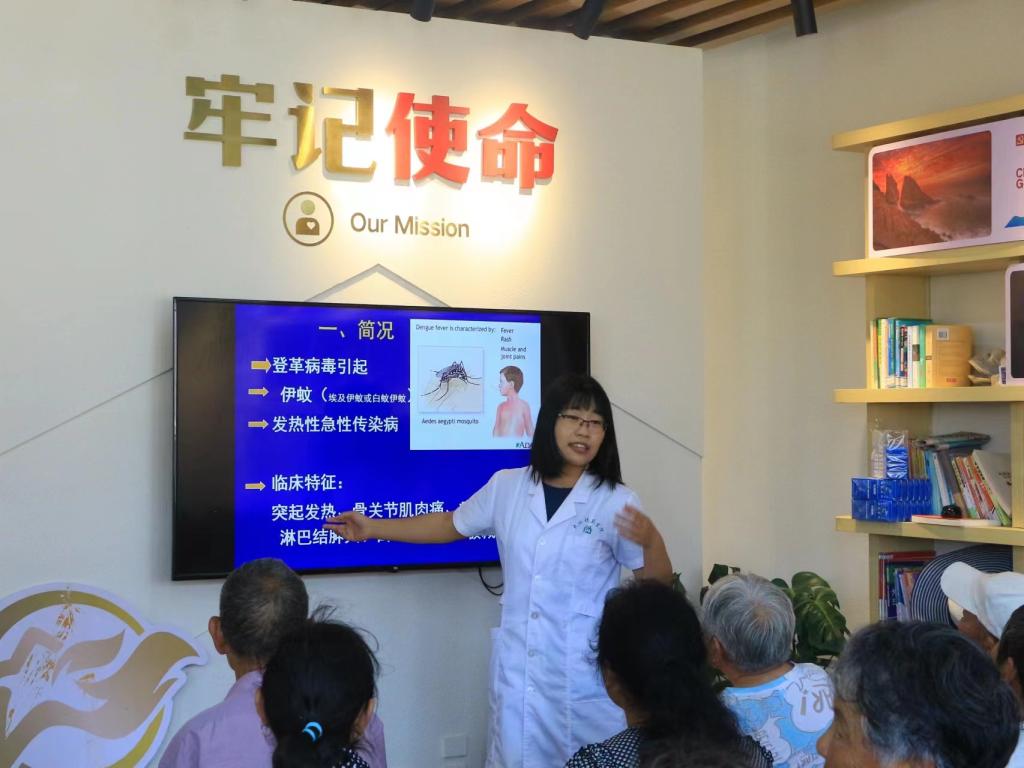 大陈镇卫生院援岛护师李浩岚开展健康生活宣教,为居民讲授海岛易发疾病——登革热,围绕疾病病因、临床表现、流行情况等,用通俗易懂的语言,使海岛居民详细了解登革热这一疾病,讲解预防与治疗的要点,并解答现场观众提问。