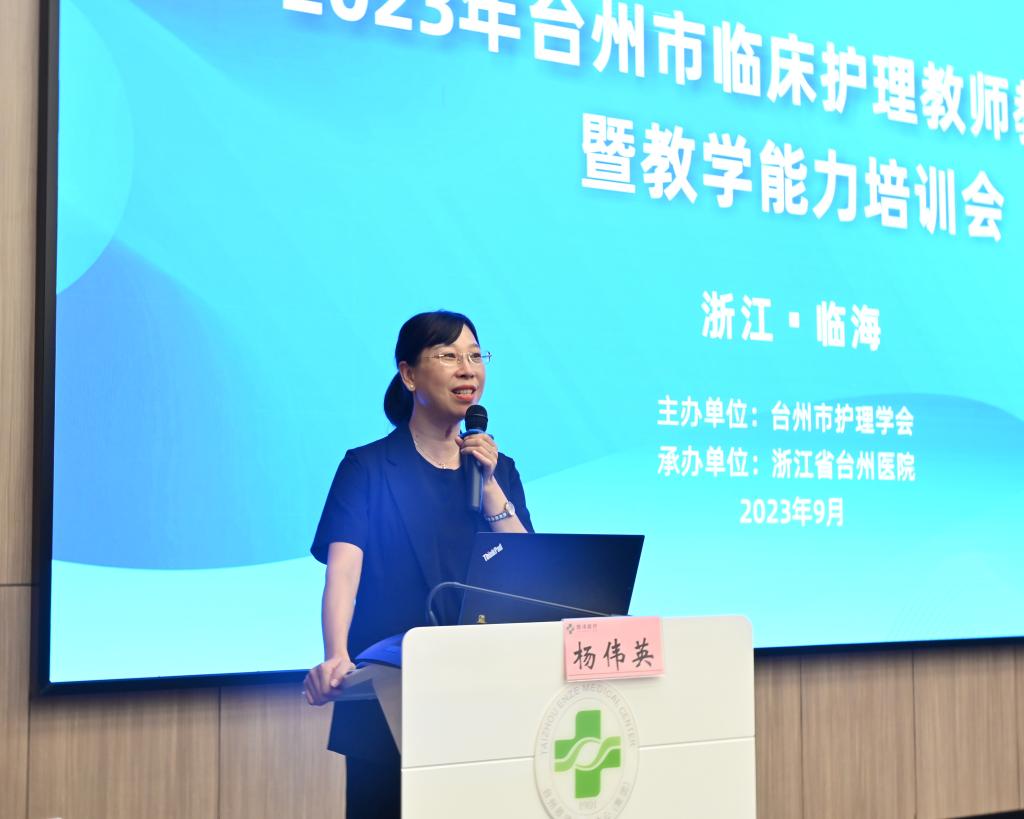 台州医院杨伟英副院长致开幕辞,她对各位专家和参会人员表示热烈欢迎和诚挚感谢。她表示,在台州学院及医院党委的正确领导下,依托科教融合平台,不断加强护理教学建设,临床护理建立了以教促学、教学相长的良好机制,教师教学水平、教学质量均取得了长足进步。她希望临床护理人员站在更高的起点上,继续秉承教育初心,传承优良传统,与时俱进,革新突破,推动医院临床护理教学工作迈上新的高度。