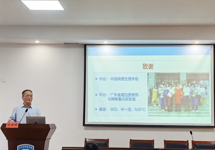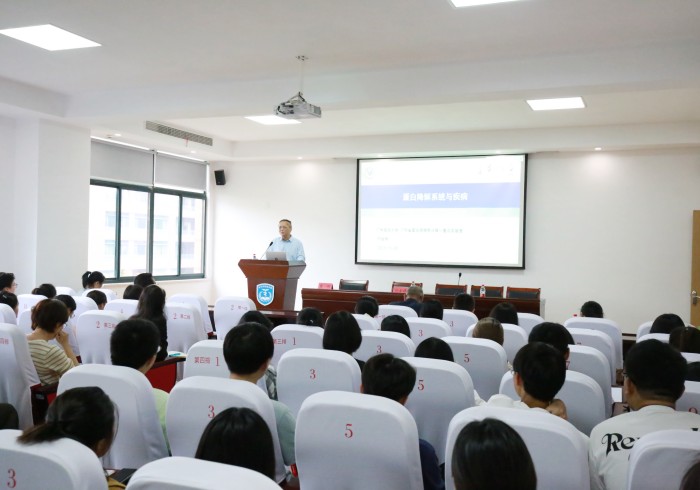 在题为《蛋白降解系统与疾病》学术报告中,刘金保教授指出去泛素化酶保证泛素化修饰的可逆性,调控蛋白质的降解,成为肿瘤药物治疗中的新靶点。他介绍了近年来团队致力于泛素蛋白酶体系统与肿瘤发生发展调控作用的分子机制研究,提出了生理浓度ATP负性调节蛋白酶体功能的新理论;发现了组织特异性蛋白酶体抑制剂藤黄酸、19S蛋白酶体相关去泛素化酶金属离子化合物抑制剂、胆红素介导蛋白酶体抑制、蛋白酶体抑制剂在血液淋巴系统肿瘤中的作用;开辟了治疗伊马替尼耐药性CML的全新方向。