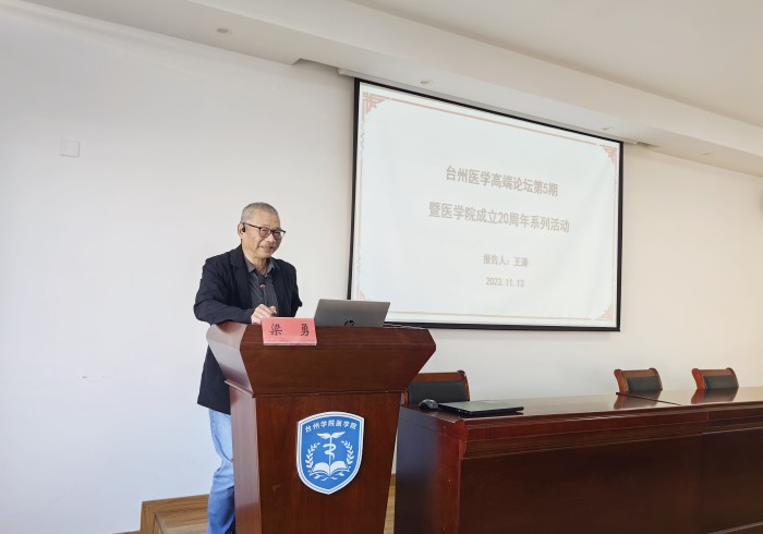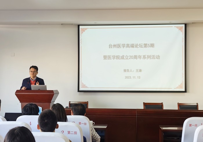 11月13日,医学院举办台州医学高端论坛第5期暨医学院成立20周年系列活动,美国疼痛管理学院院士王涛博士应邀到校作学术报告并受聘台州学院附属康复医院(台州众安康复医院)外方院长。医学院院长曹轩、梁勇教授共同主持,浙江众安健康产业有限公司总经理余小东、学校附属康复医院院长庄汝波、医学院师生代表等五十余人参加会议。