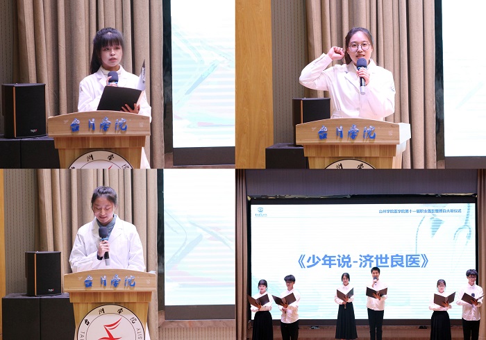 院学生会执行主席姚淑宁作为老生代表发言,激励新生们更坚定地在医路上前行;23级新生代表徐子珺发言,阐述学医路上增加硬实力、磨练软实力的重要性;23级新生班主任、辅导员、毕业学长学姐们送来视频祝福,传达医学生“健康所系、性命相托”的使命,表达对新生们的期望与谆谆教诲;主持组借《少年说——济世良医》送上最诚挚的祝福;分团委副书记章琳旖带领新生们郑重宣誓,立下永恒誓言,牢记“恪守医德、尊师守纪”的规矩,竭尽全力除人类之病痛,助健康之完美。