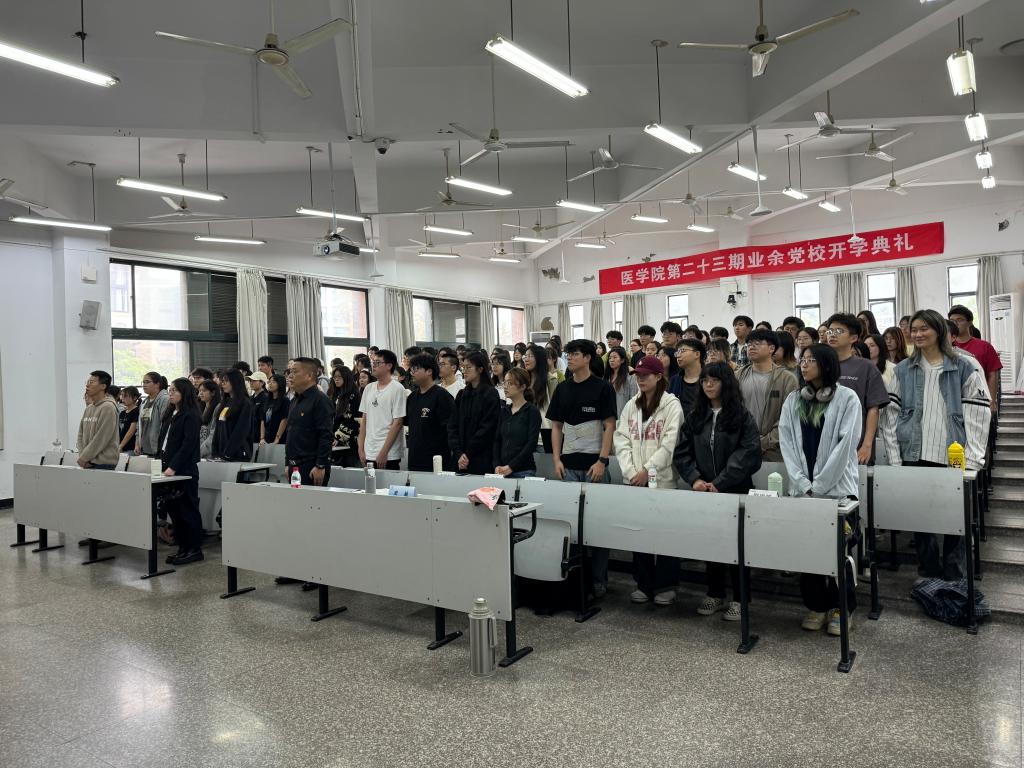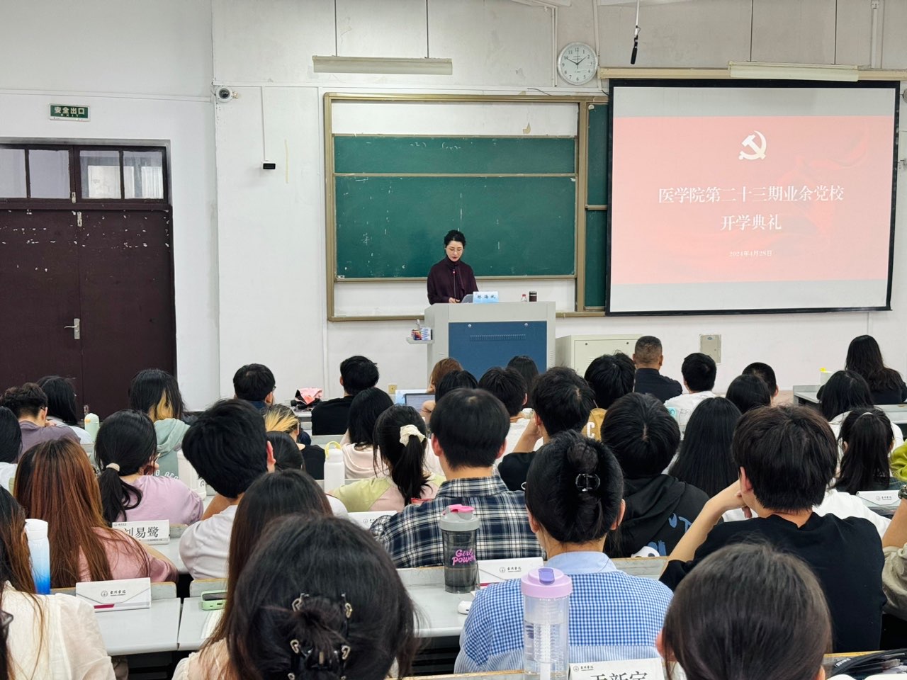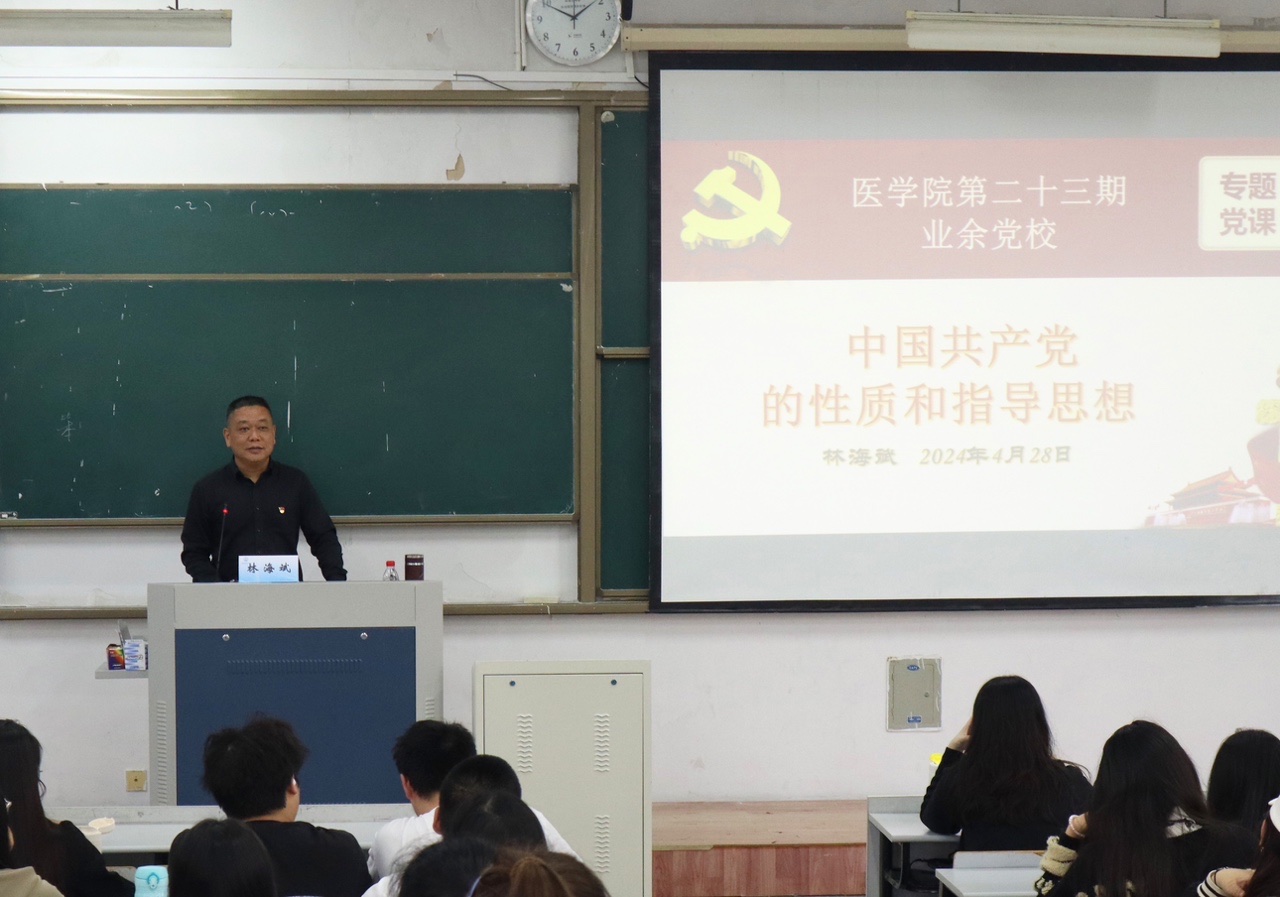 4月28日,医学院第二十三期业余党校开学典礼暨专题党课第一讲在2201举行。学院党委书记林海斌出席并授党课,组织员及143名师生入党积极分子参加典礼,学院党委副书记周敏主持。
