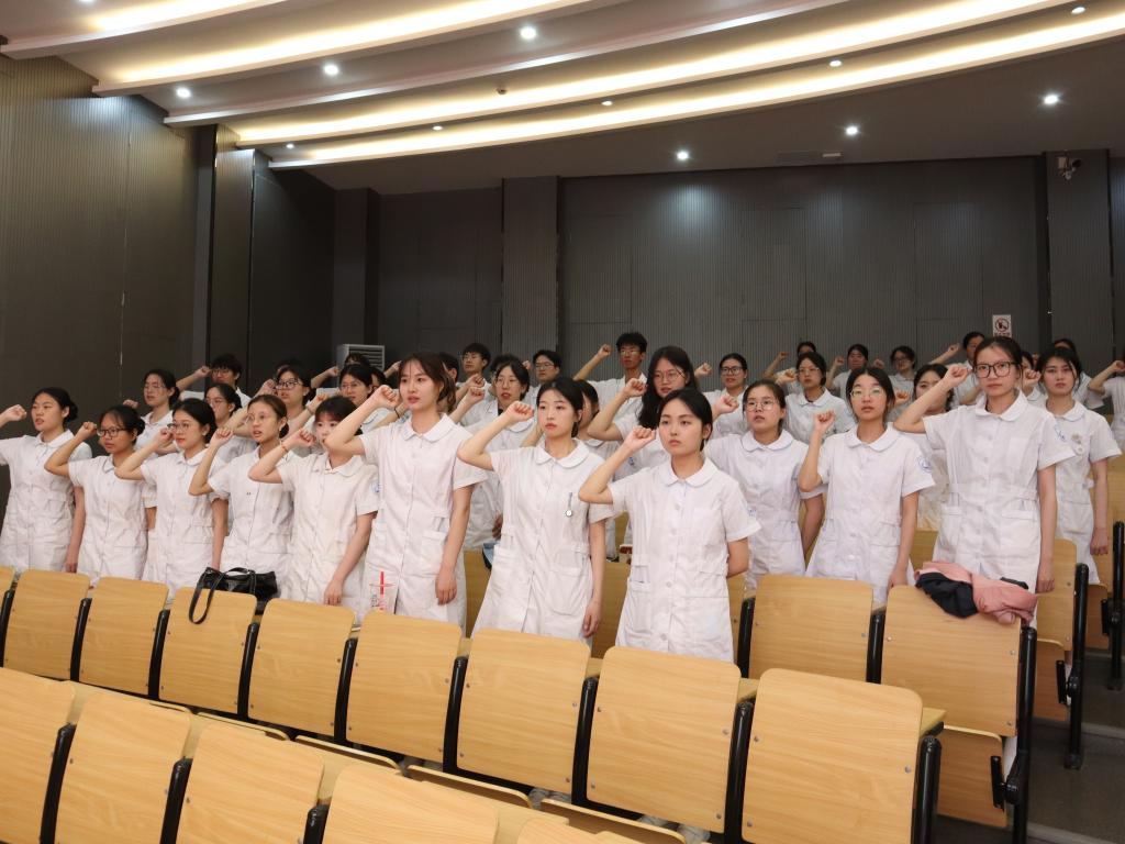 20级护理学子分享实习考研经验,并给予21级学生美好祝福。学生代表章琳旖发言,讲述护理工作和学习中面临的挑战与收获,希望同学们共同努力,以昂扬的斗志和饱满的热情,将关爱和幸福洒向人间,为保证广大人民群众的生命的安康,为国家的富裕、事业的发展予以贡献。随后护理系教师代表们为护士生授烛,护士生们身着白袍依次上台,躬身双手接过蜡烛,寓意传承毕生奉献护理事业的精神与意志。护理系主任刘晓红带领全体护理、助产学子庄严宣誓,许下青春奉献的誓言。