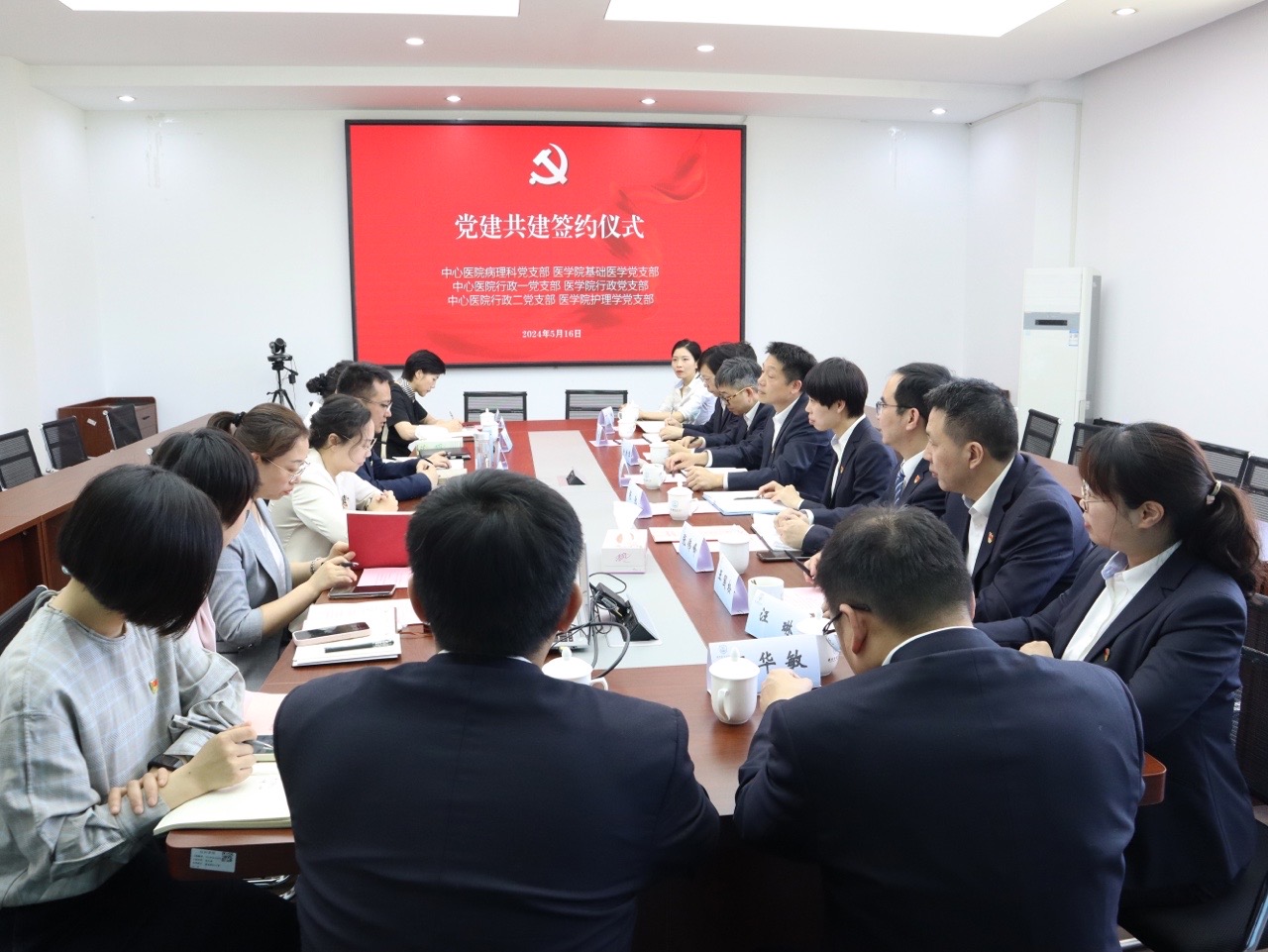 中心医院病理科党支部、行政一党支部、行政二党支部,医学院基础医学党支部、行政党支部和护理学党支部的支委们参加联建共建签约仪式。活动伊始,六个党支部书记分别就支部情况作介绍。双方支部围绕政治建设、组织建设、公益活动、特色项目和优势特长等方面深入交流,探讨支部深化合作的路径和方案。双方达成合作共识,中心医院病理科党支部与医学院基础医学党支部、中心医院行政一党支部与医学院行政党支部、中心医院行政二党支部与医学院护理学党支部签订联建共建协议书。