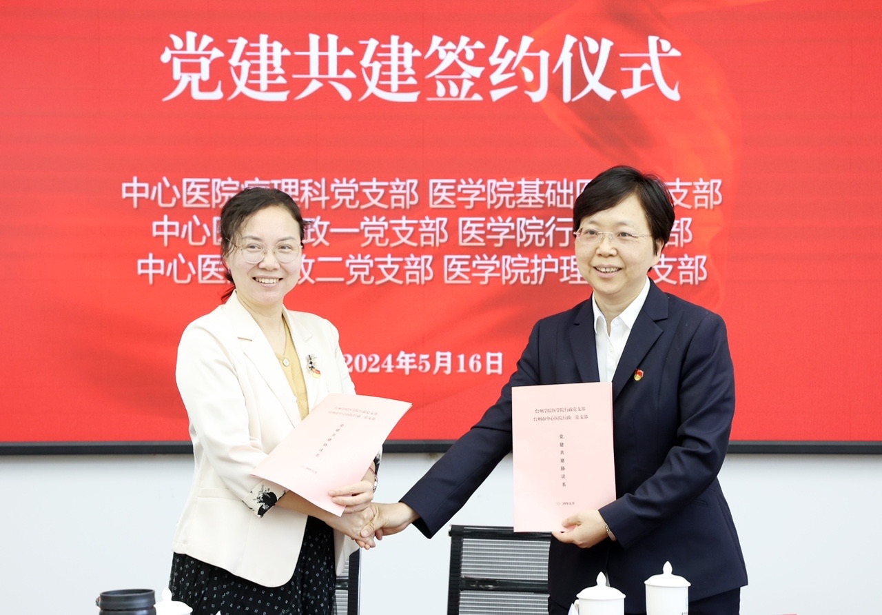 曹轩对林伟胜一行的到来表示热烈欢迎,向长期以来关心、支持医学院事业发展的中心医院各位领导表示感谢。他指出,中心医院近年来各项事业蓬勃发展,“五型五力”党支部建设有力、富有特色。校院双方有着良好的合作基础,在双聘、会商等制度的保障下深化人才培养、科研攻关等方面的合作,双方事业均取得了良好的进展与突破。此次双方党支部的党建共建签约是新的起点,有利于推进党建工作与校院双方中心工作的双融双促。他提议,双方党支部围绕“共谋发展、共育仁心、共传仁术、共争上游”精准发力,更好的发挥双方的专业、资源和人才优势,共同开展形式多样的医德医风和职业素养教育活动、联合申报和攻关国家及地方的高级别科研项目、携手培育更高层次更高水平的科研成果。