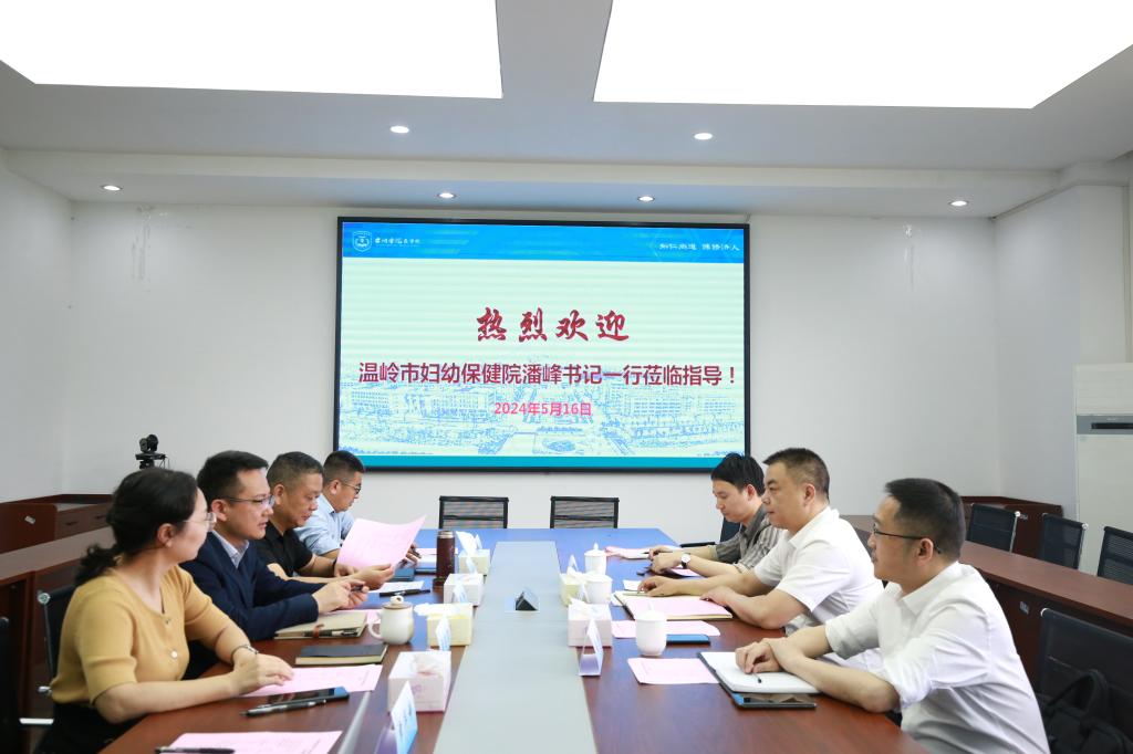 5月16日下午,温岭市妇幼保健院潘峰书记、潘琦院长一行到医学院调研,科教科主任盛芝敏陪同。医学院院长曹轩、党委书记林海斌、副院长胡琼莹、陈光出席座谈会。