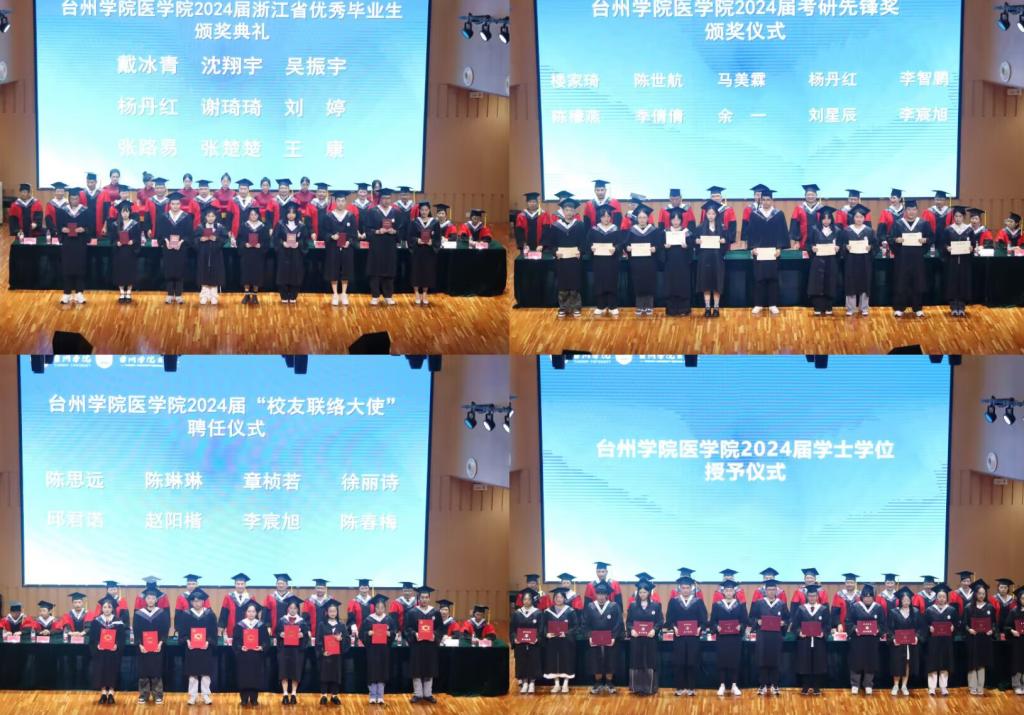 毕业典礼由医学院党委书记林海斌主持。医学院院长曹轩宣读学士学位授予决定及省优秀毕业生、校优秀毕业生、校友联络大使聘任文件。2024届医学生共有431人获得学士学位,其中,18名毕业生获得“浙江省普通高等学校优秀毕业生”称号,54名毕业生获得“台州学院优秀毕业生”称号,8名毕业生被聘为“台州学院校友联络大使”。与会领导共同为获得“浙江省普通高等学校优秀毕业生”称号的毕业生颁奖,为“台州学院校友联络大使”颁发聘书。