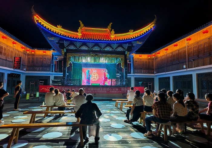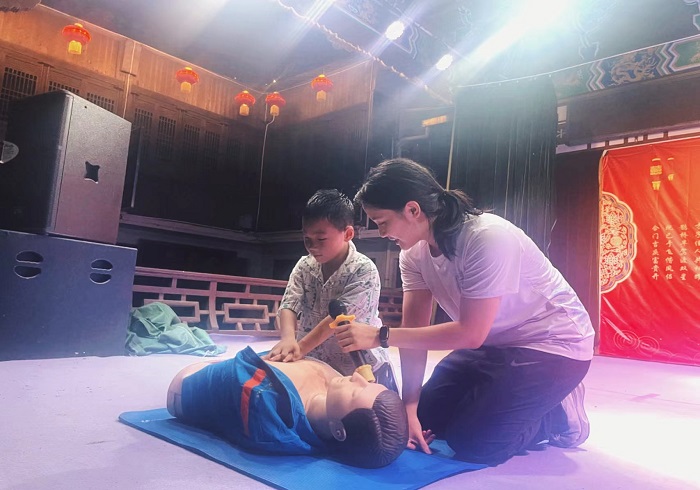 为丰富村民精神文化生活,普及应急救护知识,6月30日傍晚,岩下潘村水坊街戏台灯火通明,台州学院的学生紧张地做最后的准备。晚19点08分,好戏开场!台州学院、台州科技职业学院客座教授、浙江省青年舞台剧导演、浙江省戏剧家协会会员张健老师指导,实践队成员参与表演,为大家带来了一场精彩纷呈的越剧演出。《送花楼会》《打金枝》《梁祝·十八相送》《化蝶》……一场场经典剧目点燃了观众们的热情,鼓掌声叫好声源源不断。越剧表演后,实践队成员为现场观众带来了应急救护知识小课堂,讲解心肺复苏术(CPR)的步骤、海姆立克急救法的步骤,本地的同学进行逐句方言的翻译,并邀请观众上台进行演练,其中最小上台的观众年仅9岁,已经能在提示下较好地完成心肺复苏术。演出结束后,观众们依依不舍,纷纷表示喜欢这样的表演和学习救护知识的形式,希望老师和同学们能够常常到村里来进行演出。