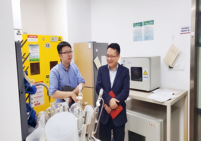 交流会后,曹轩一行参观了医药化工学院的科研与技术服务平台、实验室和成果展示走廊。
