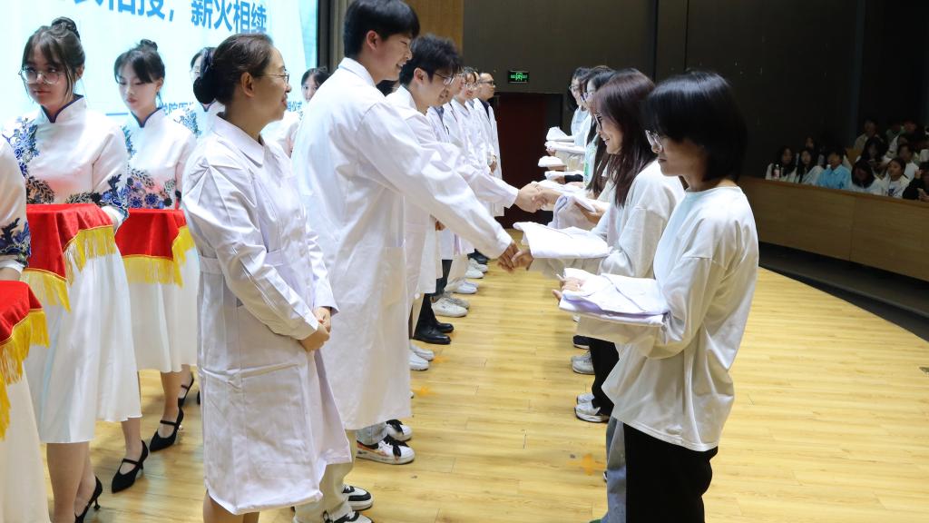 11月12日晚,医学院在3207教室举办第十二届职业宣誓暨授白大褂仪式。医学院副院长陈光、护理系主任刘晓红、各专业教师代表应邀出席,将象征着爱与生命的白大褂授予给2024级医学生。