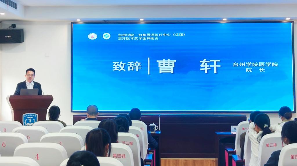 曹轩致辞。他介绍了台州学院医学院和恩泽医疗中心(集团)同宗同源的密切联系,感谢恩泽医疗中心(集团)长期以来为医学院的学生成长和学科建设等方面提供的鼎力支持。