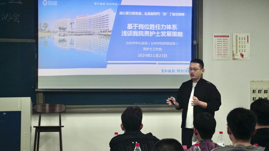 11月23日下午,医学院在2-202教室举办以“经验点亮希望,分享筑造桥梁”为主题的男护交流会,邀请台州恩泽医疗中心(集团)的张鹏、智程琦,台州市第一人民医院的陈旗滨、杨恒、王礼红、金喜强和周墨涵,台州市中心医院的孙博、王延平、黄峰、汪妙泉、陈诺、李兴远和黄于权等14位一线护理人员,与2024级护理学男生面对面交流,引导同学们增强对所学专业的职业认同,了解工作上的责任与担当,有目的有动力地学习专业知识。
