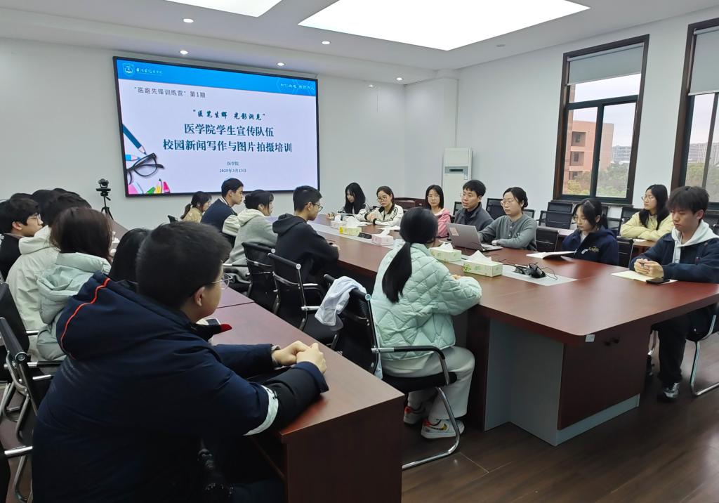3月13日下午,医学院“医路先锋训练营”第一期暨“医笔生辉,光影洞见”学生宣传队伍业务培训会在A305室举行。学院宣传员徐罗月聚焦校园新闻写作与摄影技巧,为团委学生会媒体中心近30名学生骨干授课,助力学生宣传队伍提升专业能力,为进一步讲好医学院故事注入新动能。