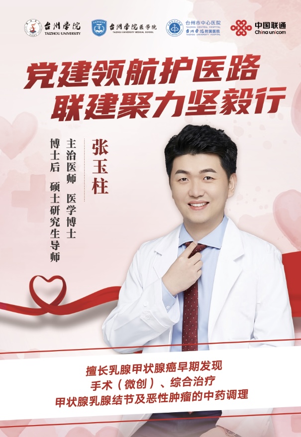 人物简介:张玉柱,台州学院医学院院长助理,台州市中心医院(台州学院附属医院)肿瘤外科(乳腺甲状腺外科)主治医师,医学博士,硕士研究生导师。市“500精英”特优人才,擅长乳腺癌早期发现、手术及综合治疗,主攻甲状腺癌的查和甲状腺肿瘤的外科治疗。主持国家自然科学基金1项,主持中央本级重大增减支项目子课题1项;参与国家级及省部级科研项目5项。研究成果多次被美国临床肿瘤学会(ASCO)及临床肿瘤学会(CSCO)收录,第一或通讯发表SCI论文15篇。