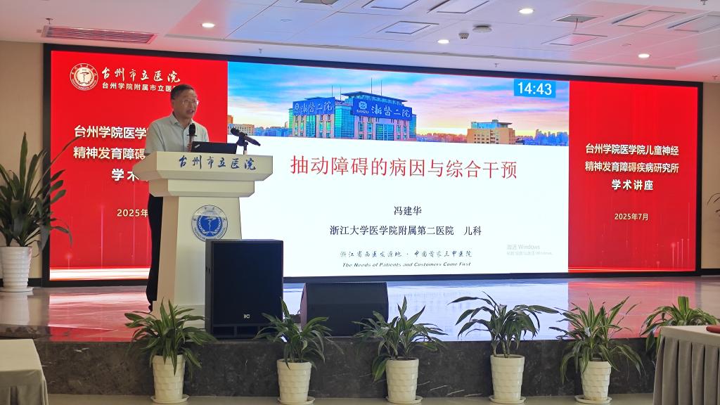 揭牌仪式后,研究所聚焦“儿童多发性抽动症”国内外研究的热点与难点举办首届学术研讨会。浙江大学医学院附属第二医院儿科主任、台州市立医院“多发性抽动症”创新团队(首批浙江省“小而强”临床培育创新团队)学术与临床指导委员会成员冯建华教授应邀到场作《抽动障碍病因与综合干预》主旨报告。他深入剖析了儿童多发性抽动症的病理机制与治疗方法等前沿动态,指出抽动障碍研究已从症状描述迈向机制驱动的精准干预时代,遗传累加效应、CSTC-小脑环路分型和肠脑轴调控等将是今后的基础研究热点问题。随后,与会专家围绕儿童多发性抽动症的诊断与治疗思路展开深入对话与交流。讨论涉及数字疗法标准化、Ecopipam/DBS革新治疗、生物样本库建设、中西医结合标志物开发等关键问题,现场观点交锋,气氛热烈。