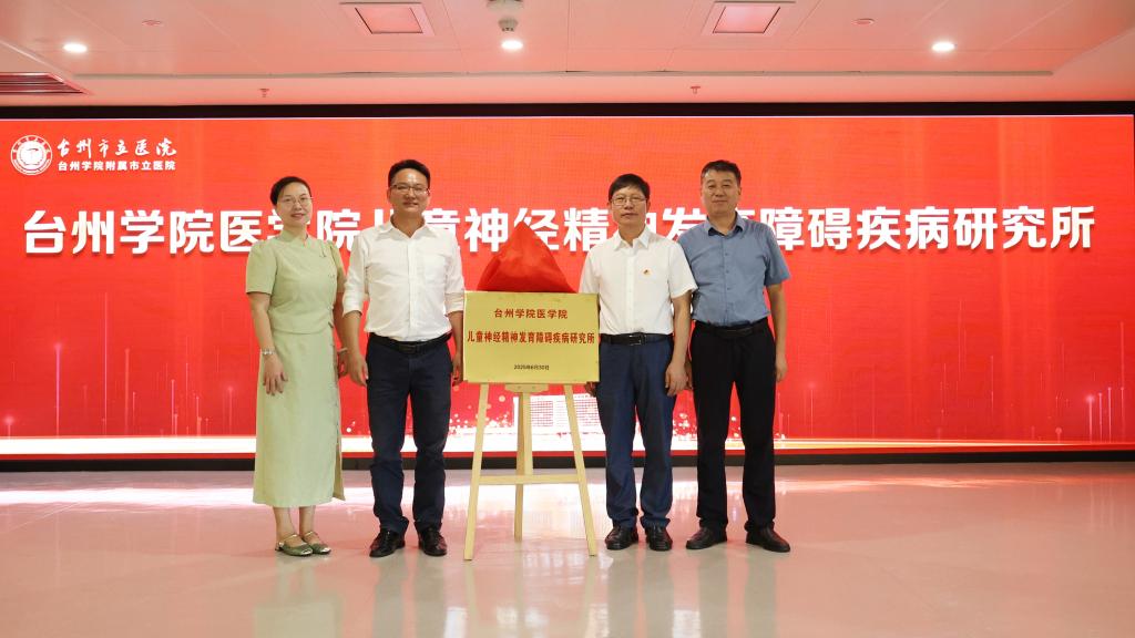 在热烈的掌声中,曹轩、王金富、胡琼莹、郎伯旭共同为台州学院医学院儿童神经精神发育障碍疾病研究所揭牌。