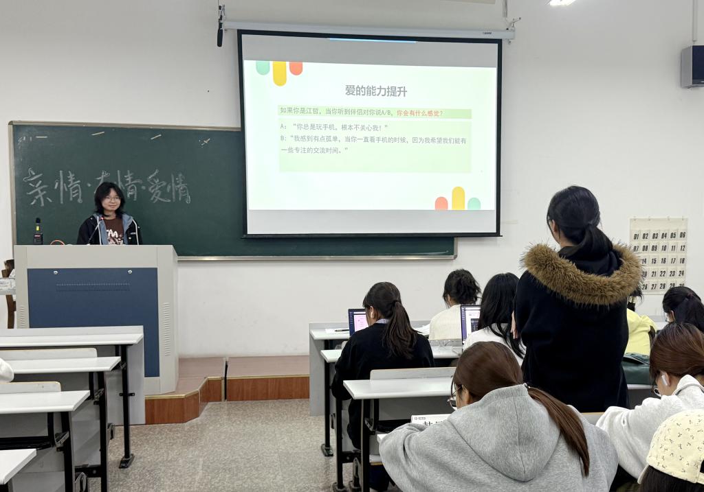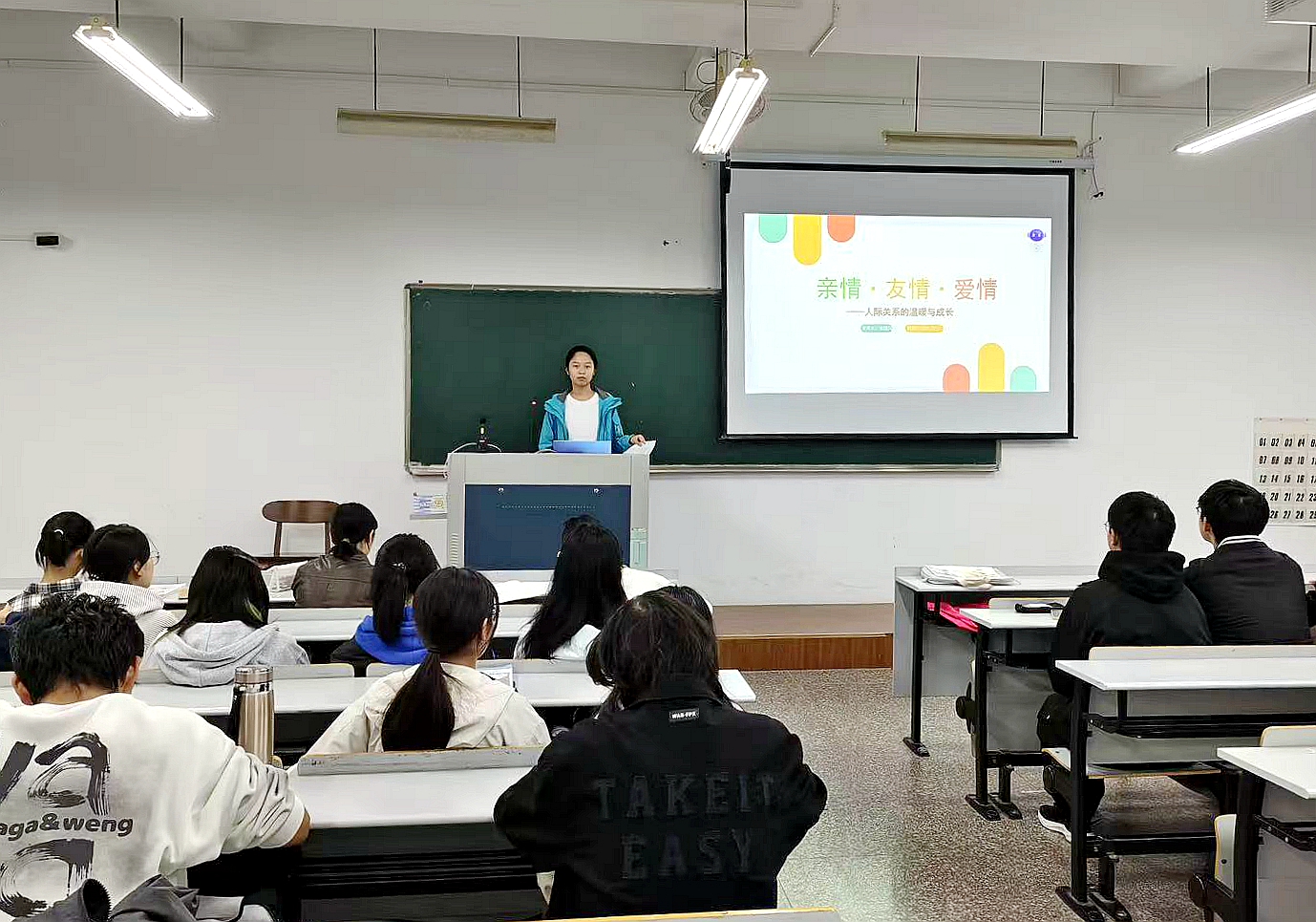 本次主题班会以“人际关系的温暖与成长”为核心,精心设计了“课程导入—分主题探索—总结倡议”三大环节。在开场导引阶段,各班通过图片视频展示、“被在乎的瞬间”分享等环节,迅速拉近了同学间的距离,让大家在温馨的氛围中感受到情感联结的温度。随后,围绕亲情、友情、爱情三大核心情感,心理委员们展开深入解读:将亲情比作“生命拼图的底色”与“情感之根”,引导新生读懂父母藏在细节里的爱,学习与家人高效沟通的技巧;将友情定义为“自由的陪伴”与“成长的绿叶”,通过“友谊小难题”讨论、深度友谊测试等互动,帮助新生明晰友情中的边界感与经营之道;将爱情解读为“最深刻的情感联结”与“共同成长的修行”,结合斯滕伯格爱情三角理论,通过案例分析、角色扮演等形式,引导新生树立健康的恋爱观,学会识别不良关系,提升爱的能力。