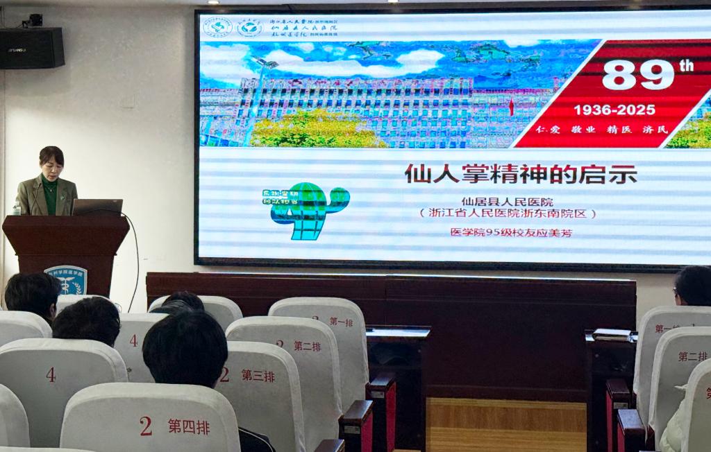 为充分发挥优秀校友的榜样引领作用,学院还特邀95级校友应美芳为在校学子带来一场题为“仙人掌精神的启示”的精彩报告会。报告会由学院党委副书记周敏主持。应美芳身兼多职,不仅是台州市透析质量控制中心委员、浙江省生物医学工程学会相关专业学组委员、仙居县人民医院宣传统战部主任,同时也是浙江省作家协会会员、仙居县作家协会副主席兼秘书长。她以仙人掌所蕴含的乐观、坚韧、担当精神为主线,生动讲述了自己毕业后的奋斗历程与取得的多元成绩,分享了仙居县人民医院深厚的人文底蕴与发展故事。她还以“三轴框架”(X轴:是什么、为什么、怎么办;Y轴:微观、中观、宏观;Z轴:过去、现在、未来)为引导,对学弟学妹们的职业规划与人生发展提出了殷切期望与宝贵建议。报告内容充实,互动热烈,深受学生欢迎。