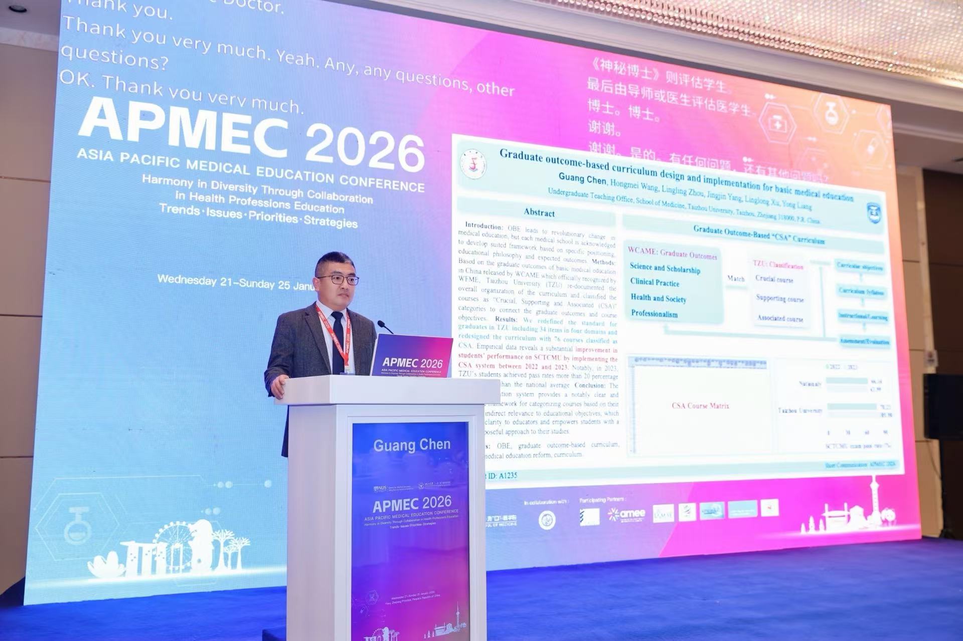 2026年1月23日至25日,亚太医学教育会议(APMEC)首次在中国举办,由浙江大学承办。台州学院医学院基于毕业要求构建的CSA课程体系教学改革成果,成功入选大会“Short Communications”环节,医学院副院长陈光代表学院作口头汇报。这是台州学院医学教育成果首次登上此类高水平国际学术平台,标志着学校在教学改革与内涵建设方面取得阶段性突破。