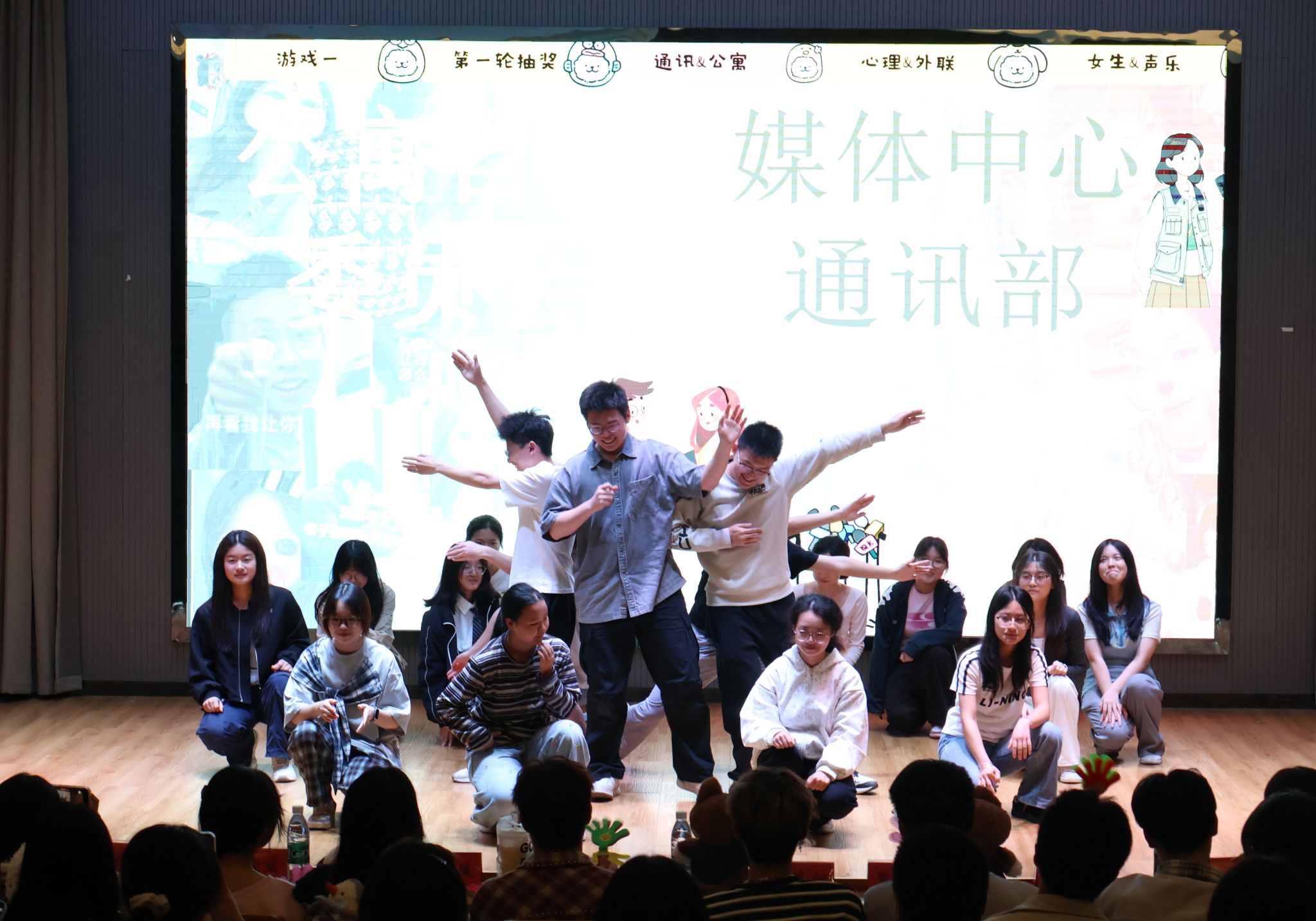 晚会以温馨活力的回顾短片启幕,幻灯片呈现了团学会各部门成员日常协作、并肩奋斗的珍贵瞬间,镌刻着团队的默契与成长,迅速点燃全场温情氛围,让“团结协作”理念深植每一位成员心中。随后,各部门代表身着创意服装进行走秀表演,风格碰撞间彰显团学会大家庭的包容与合力,正式拉开晚会序幕。