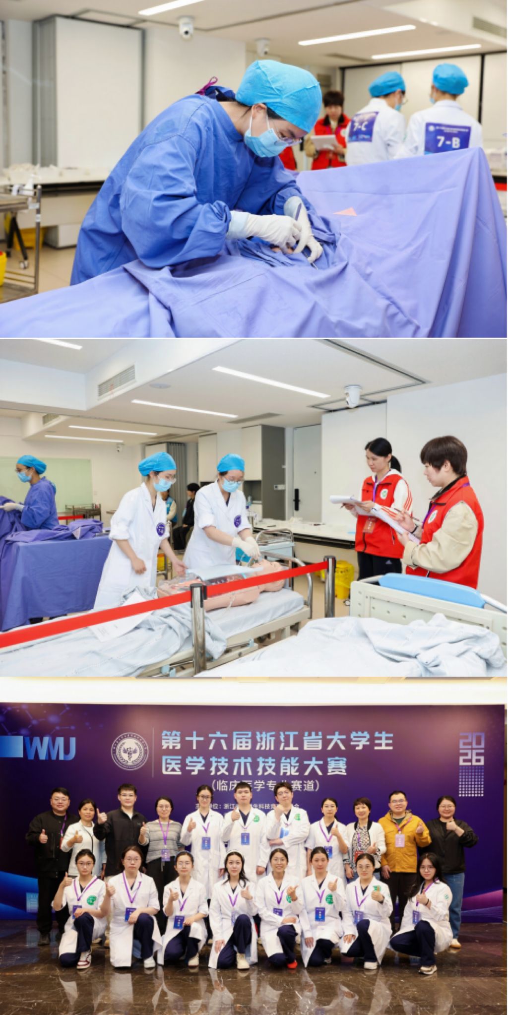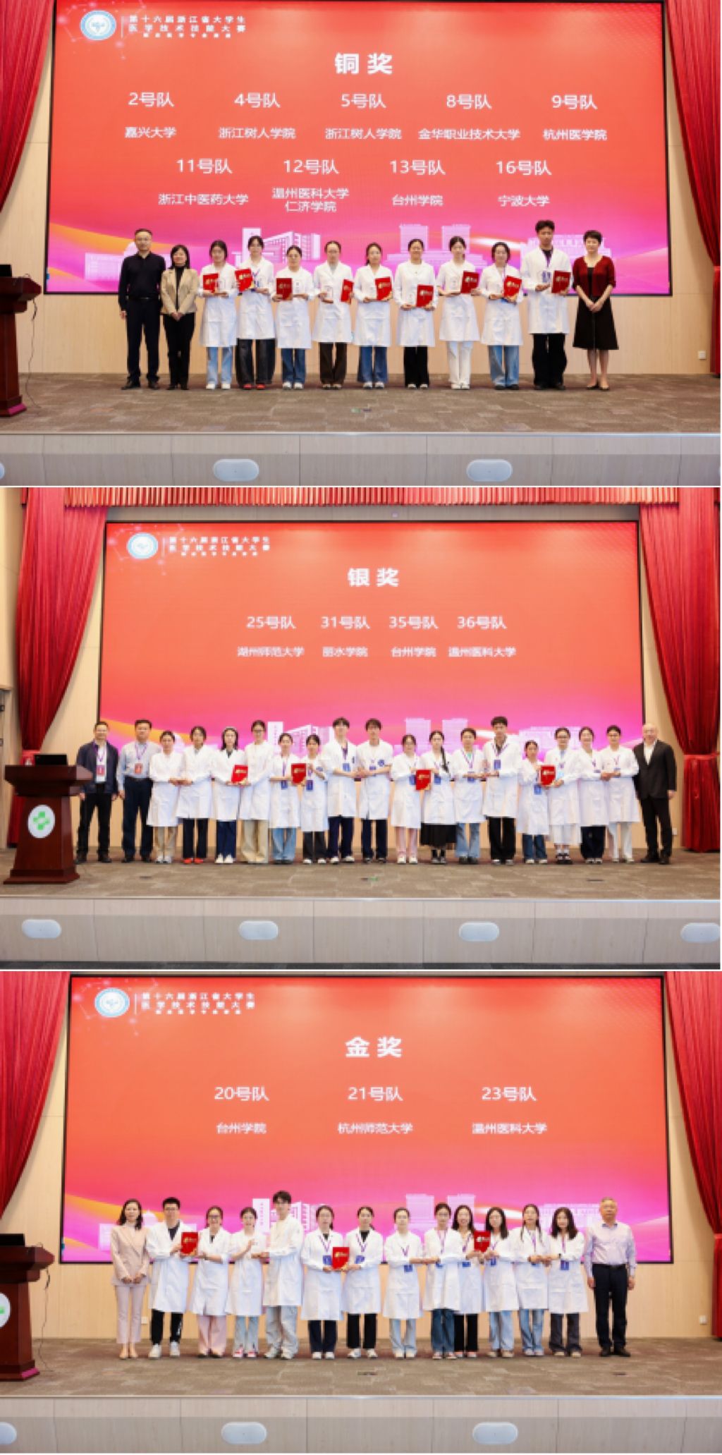 4月24日至26日,第十六届浙江省大学生医学技术技能大赛(临床医学专业赛道)于台州医院举行。本届赛事共有来自13所院校的36支队伍参与角逐。我院2021级临床医学专业的12名学生组建为三支参赛队伍,在学院及附属医院教师的悉心指导下,最终荣获大赛金、银、铜奖项,创下近年历史最佳成绩。