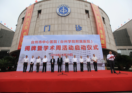 10月19日上午,台州市中心医院(台州学院附属医院)揭牌仪式在中心医院门诊广场隆重举行。 中国工程院副院长樊代明院士,省政协副主席、浙江大学附属邵逸夫医院院长蔡秀军,台州市委书记王昌荣,我校党委书记潘璋德共同为台州市中心医院、台州学院附属医院揭牌。