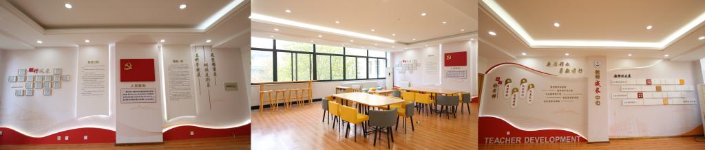该中心集党建共建、教师成长、生活服务三大功能于一体,以“小区域承载大功能”为理念,将有限空间转化为服务师生成长的“活力枢纽”,成为学院提升教学质量、服务师生需求的重要平台。党建共建区以红色文化为引领,设置党建学习角、研讨交流区,成为师生开展主题党日、思政教育的重要阵地,推动党建与教学深度融合。教师成长区常态化开展沙龙、技能培训等活动,构建专业化成长生态。生活服务区提供茶水吧、休闲书吧等便利设施,营造轻松温馨的交流环境,促进师生在课余时间碰撞思想、深化情感联结。